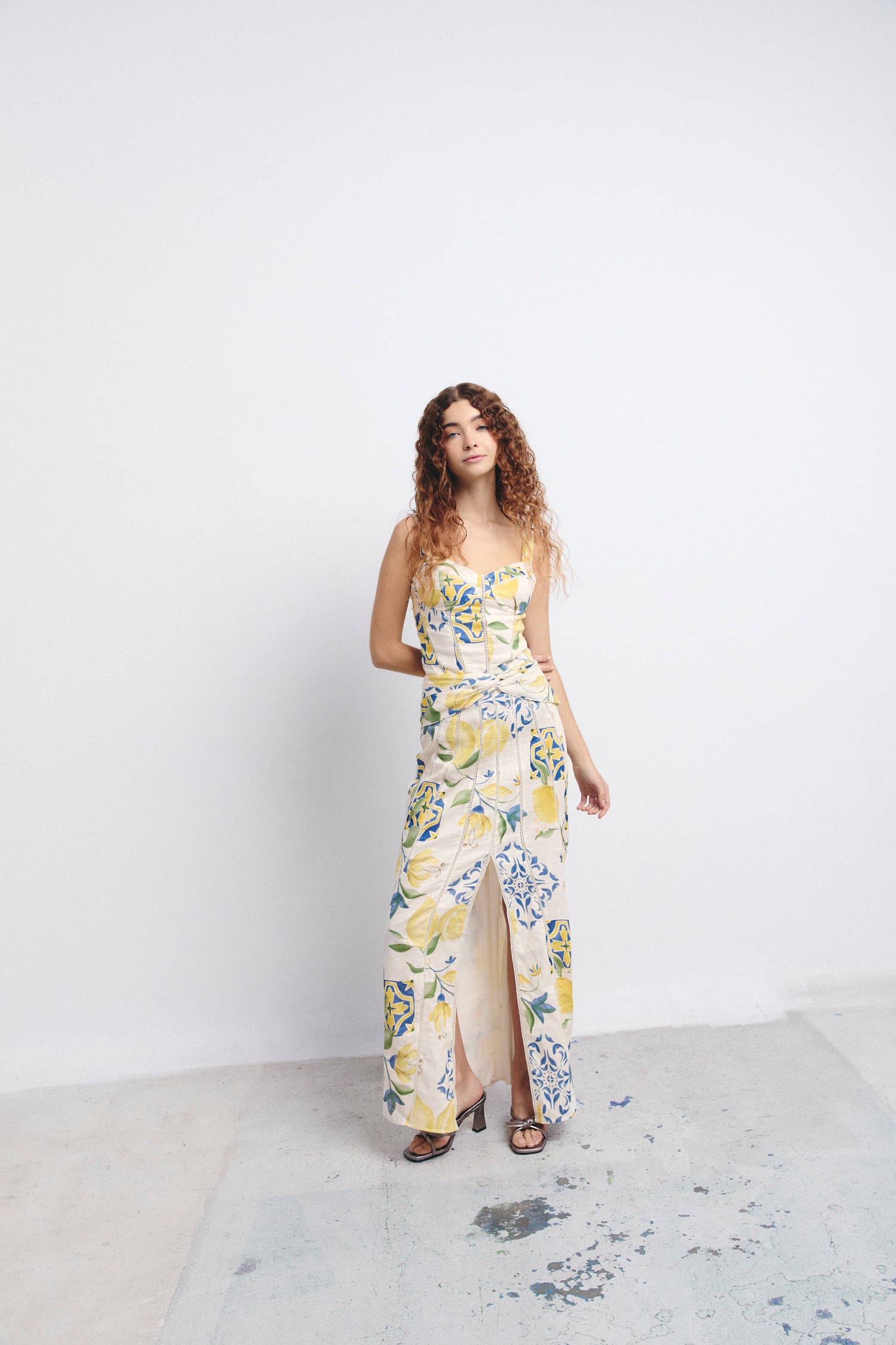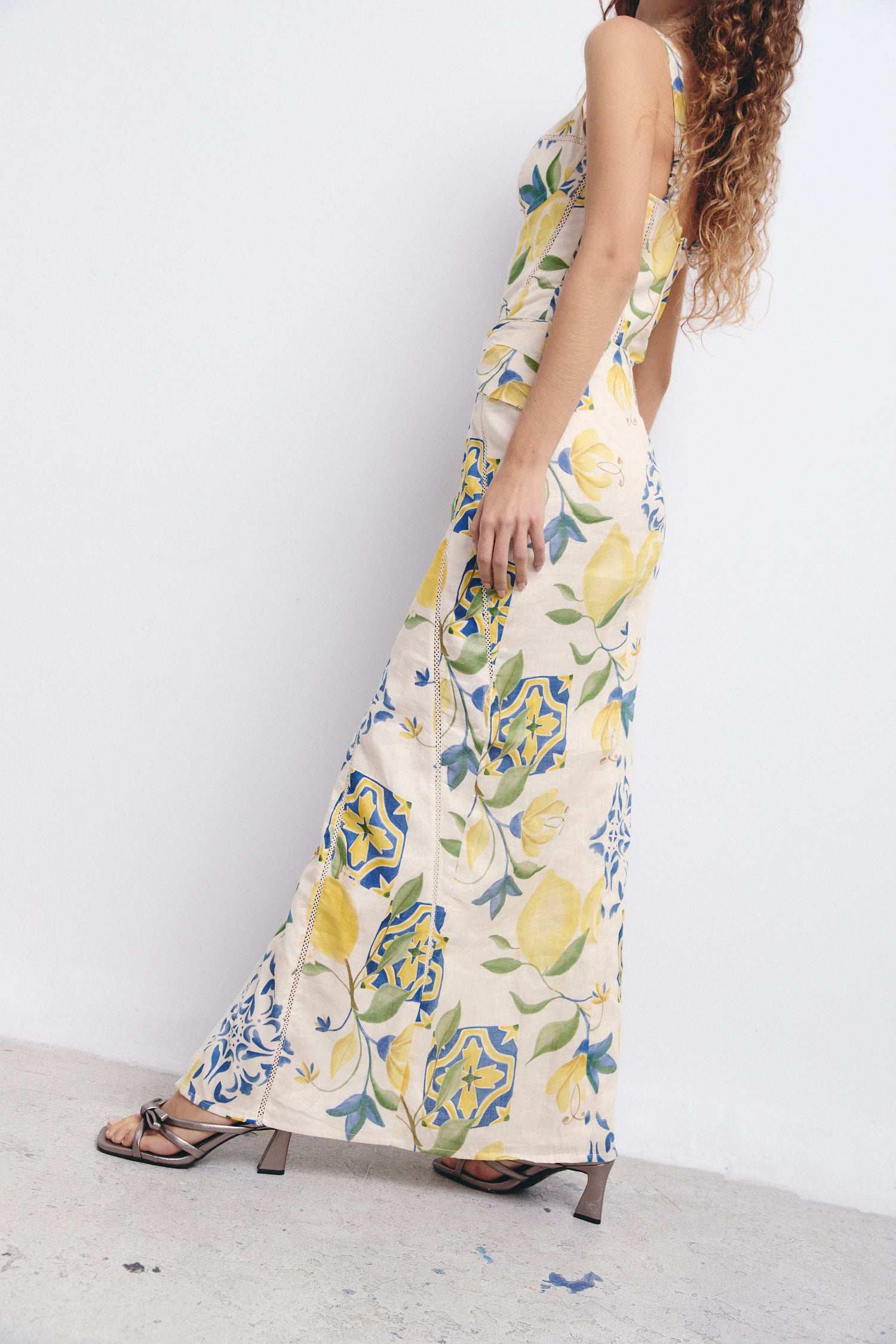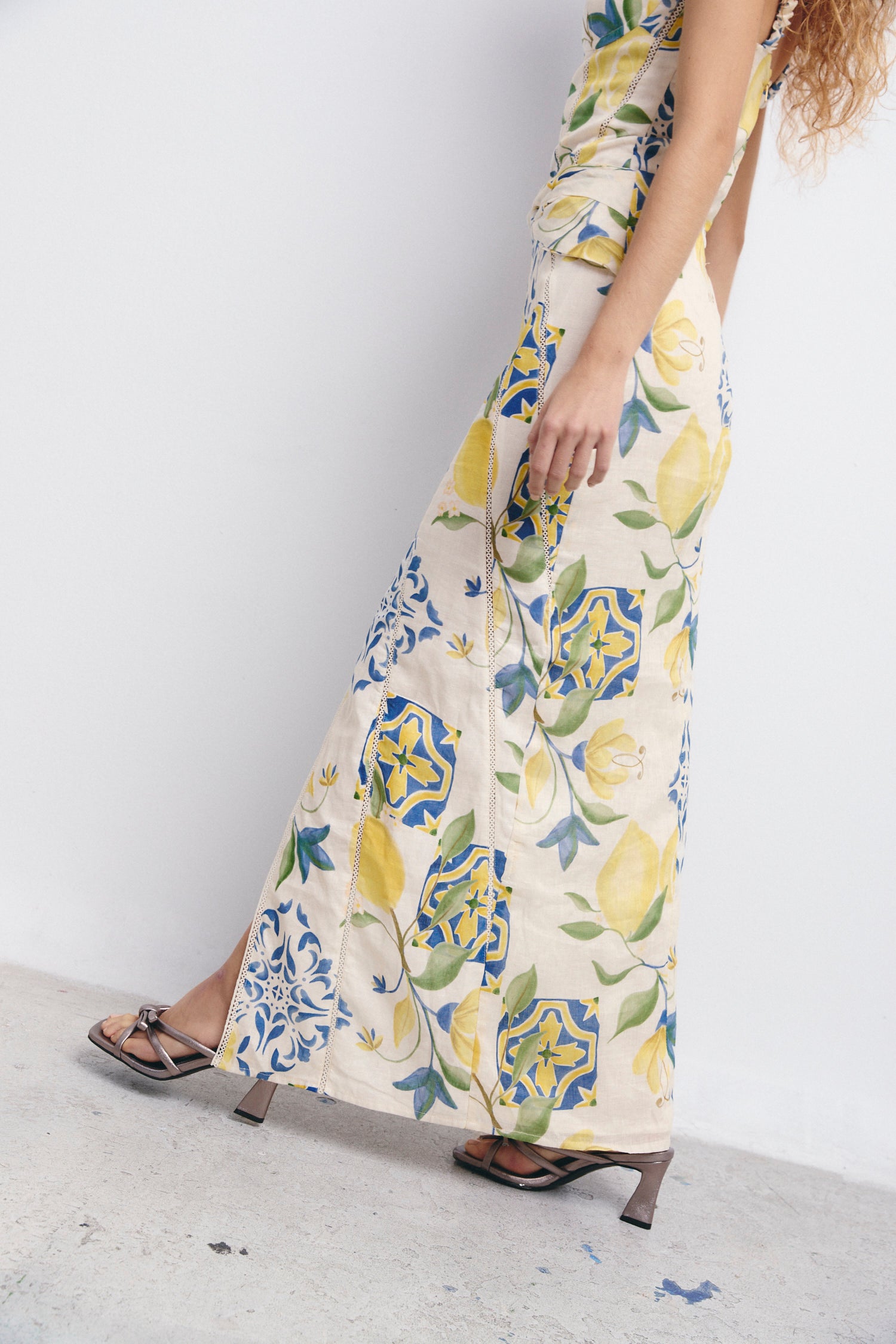 Falda larga estilo sirena, con cinturón integrado tipo nudo y detalle de aplicaciones con blondas