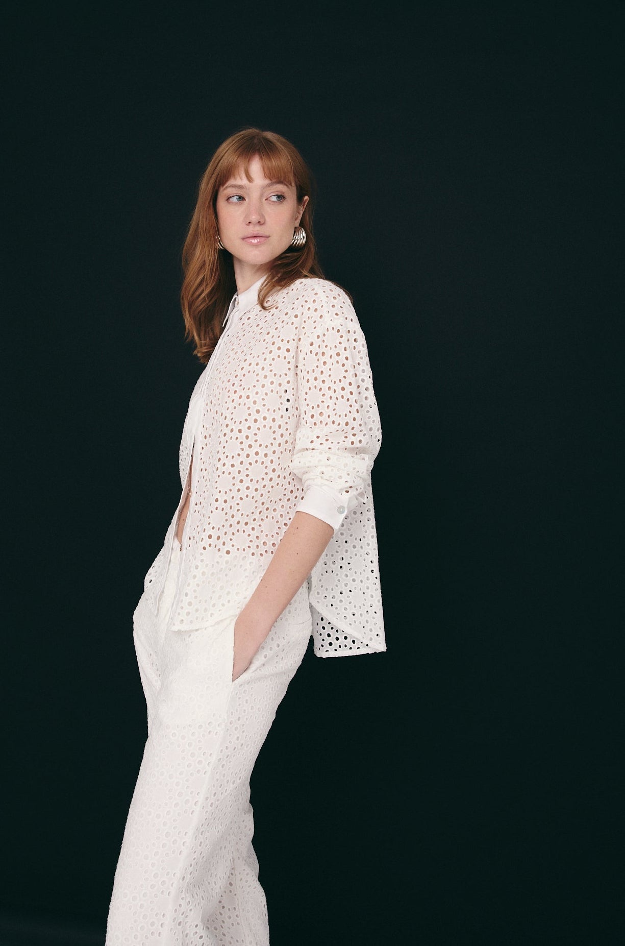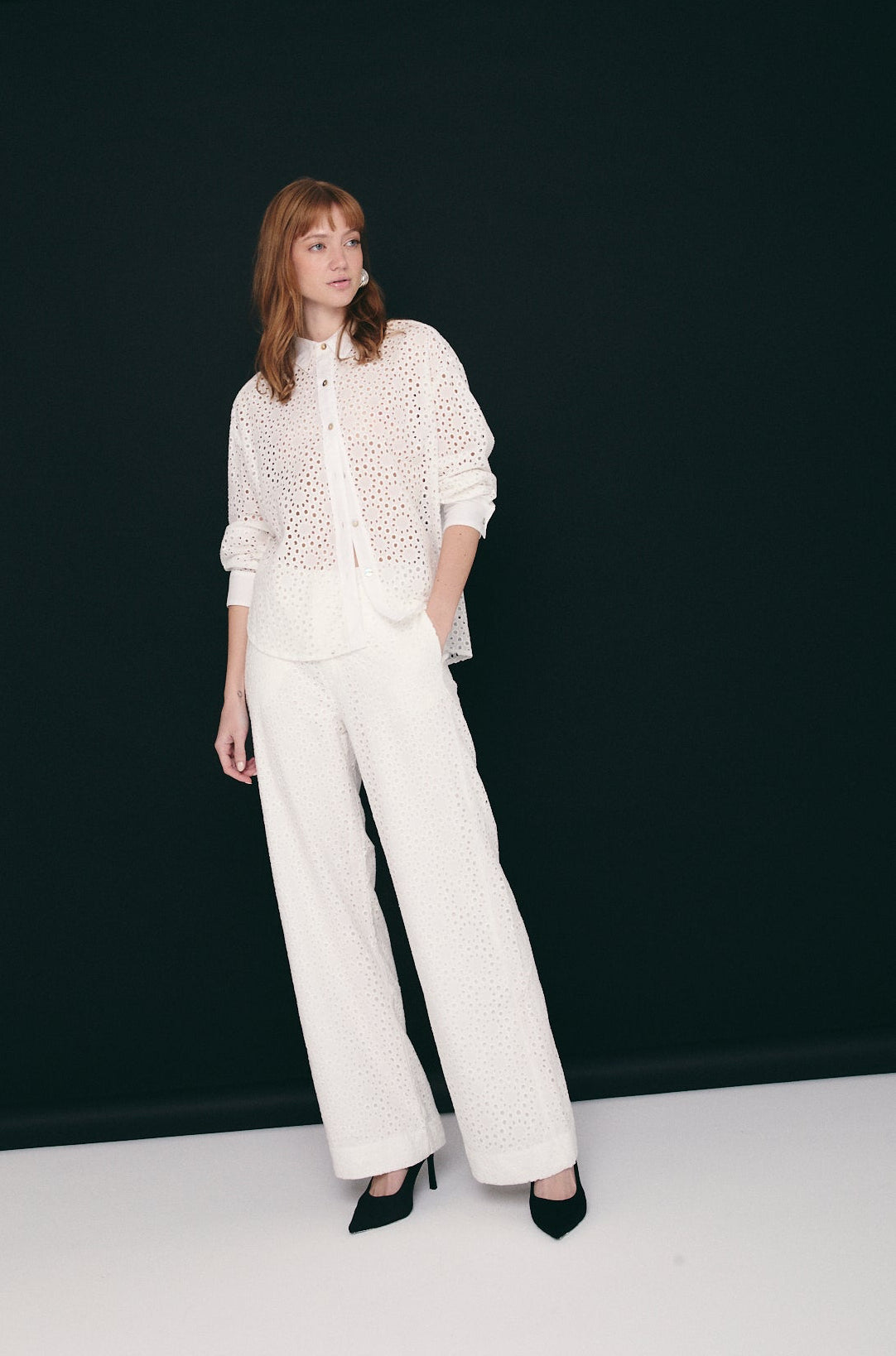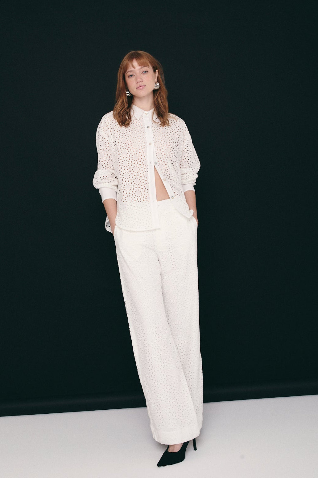 Camisa oversize hecha con broderie de 100% algodón y filos a contraste.