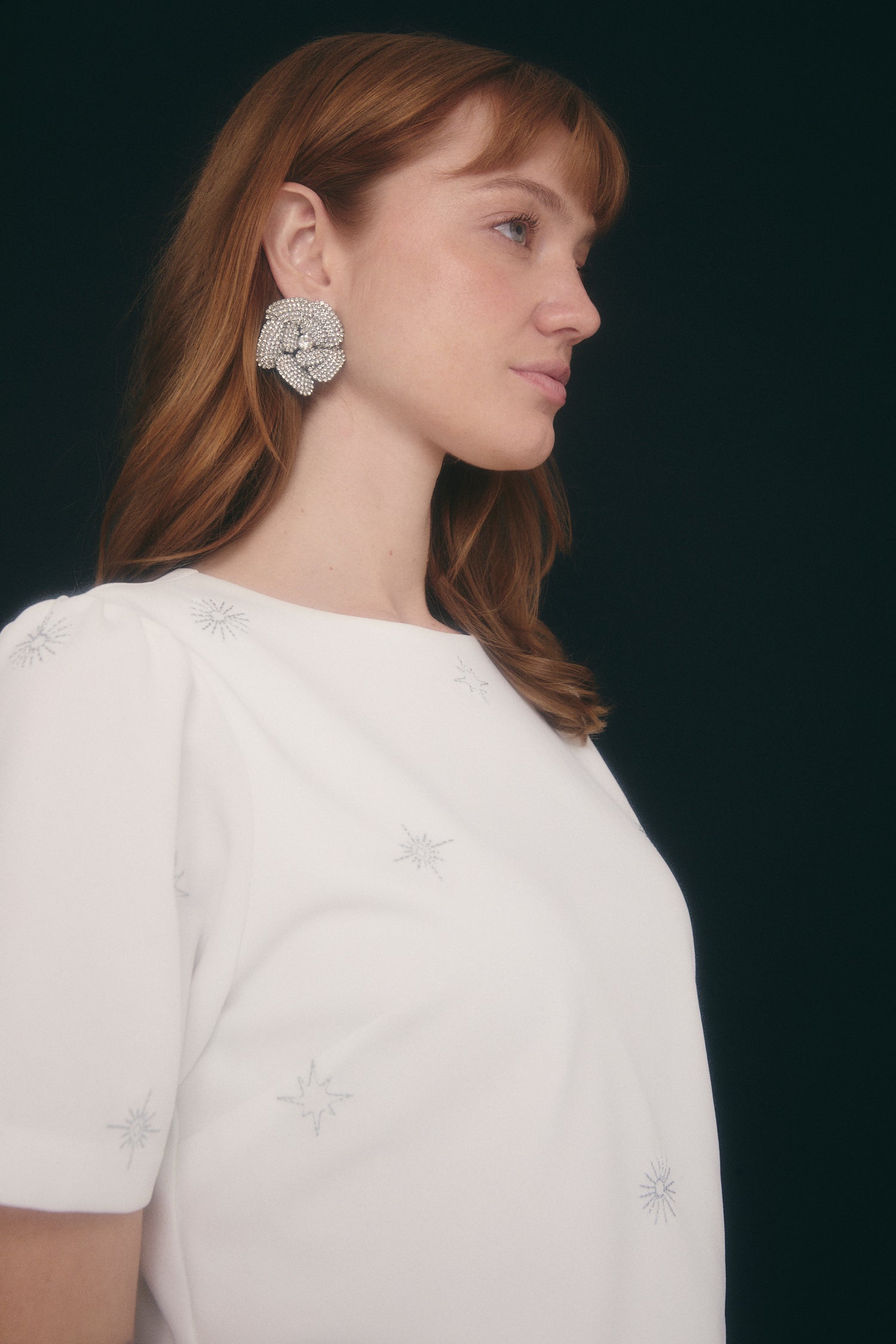 Top de manga corta estilo boxy con detalles bordados en hilo de lurex plateado y ojal en la espalda