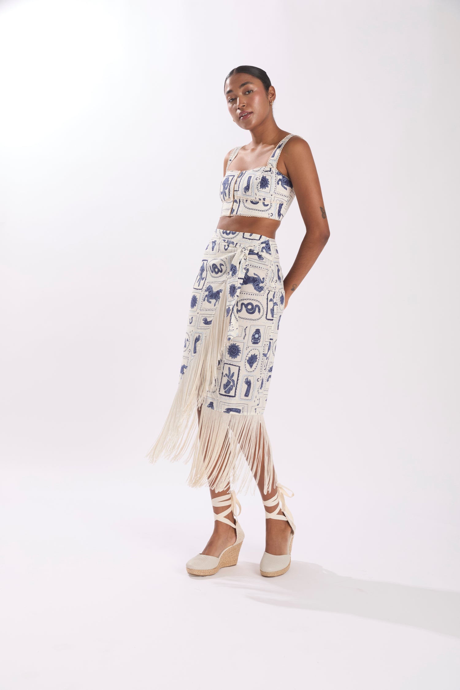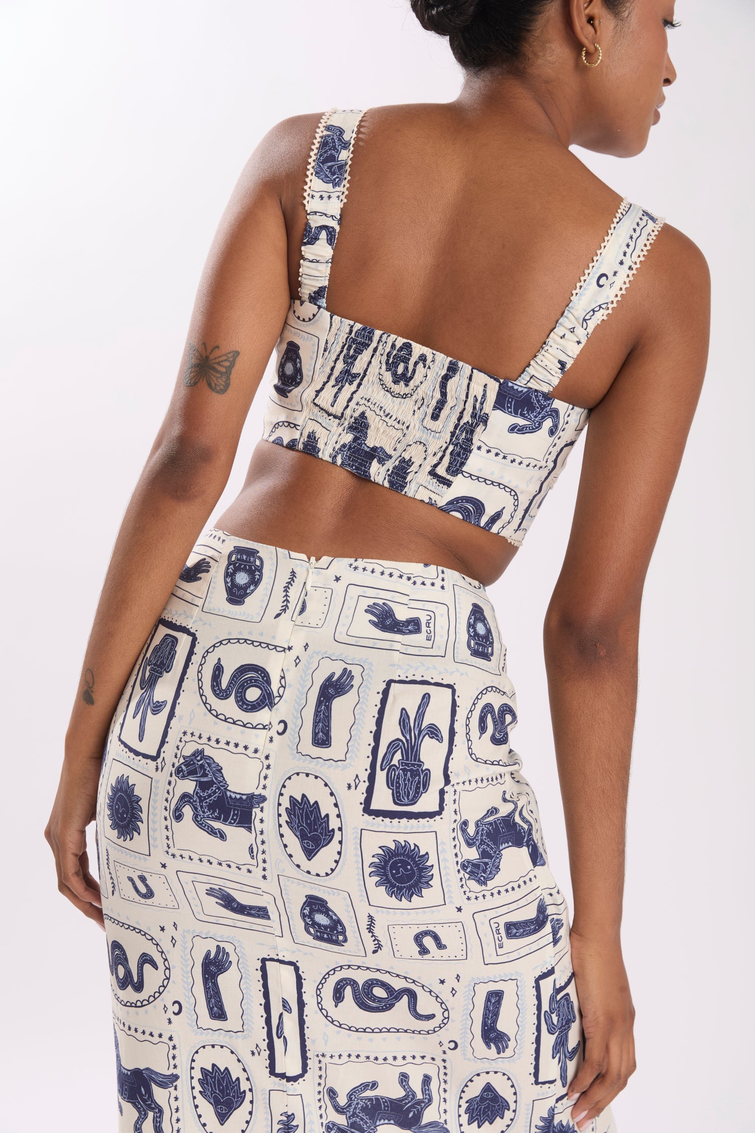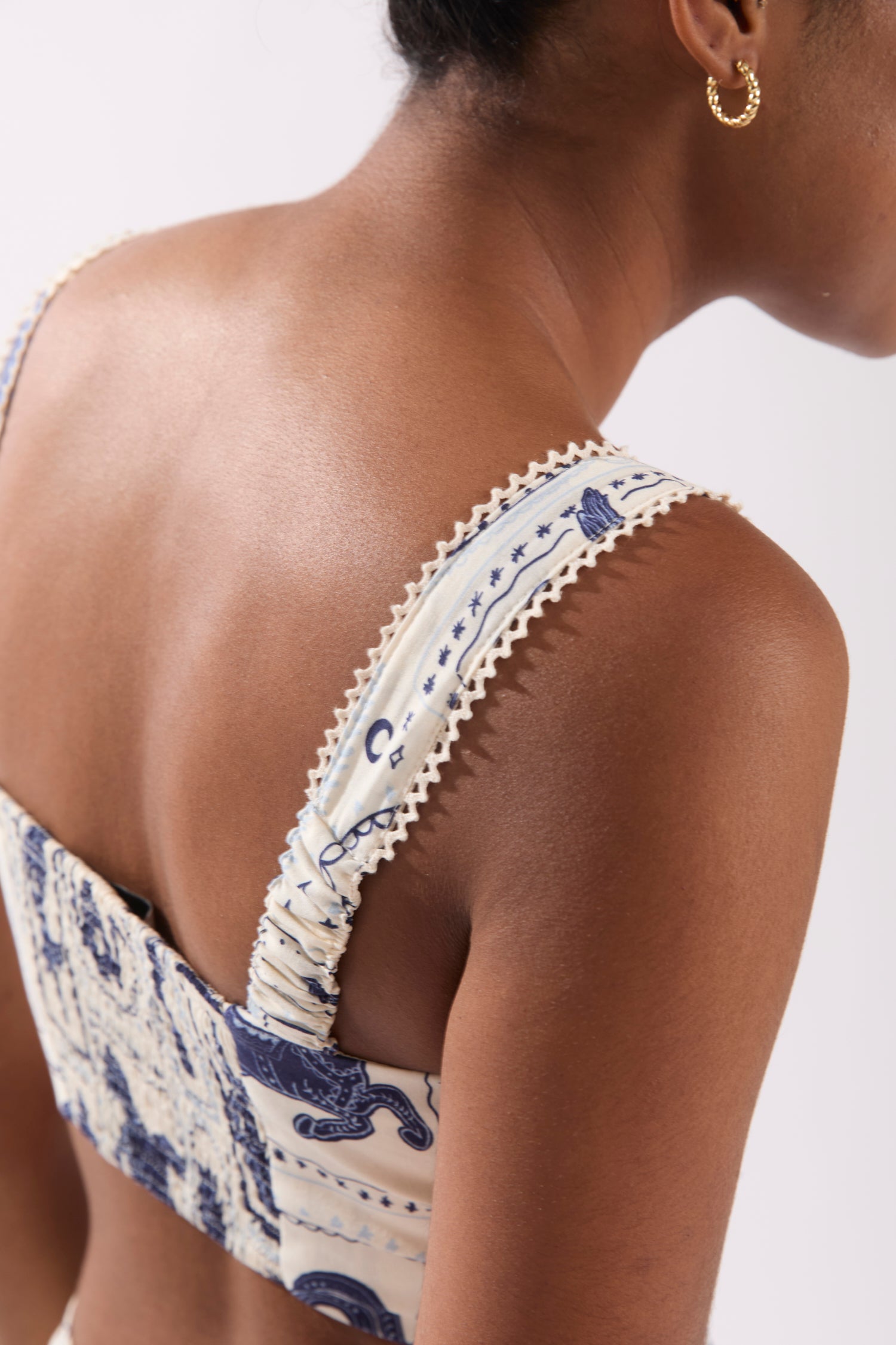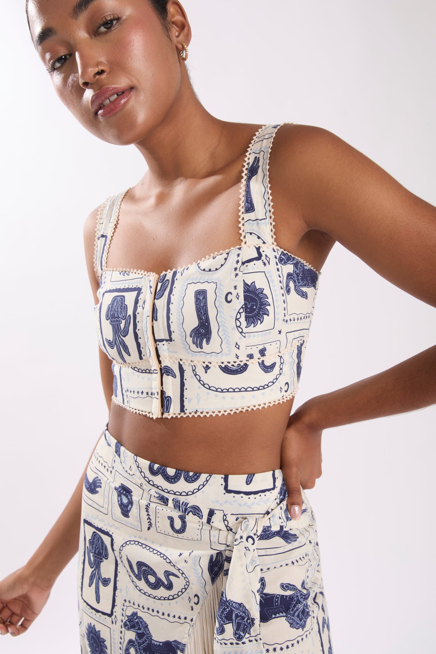 Top estilo corset hecho con print representativo de la colección, cierre lateral y nido de abeja en la espalda para mayor confort.