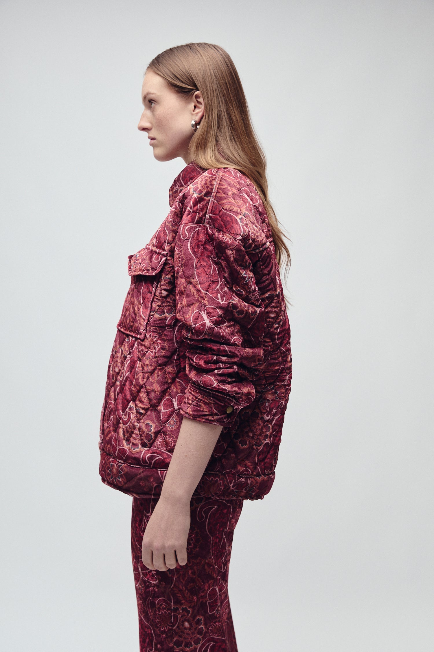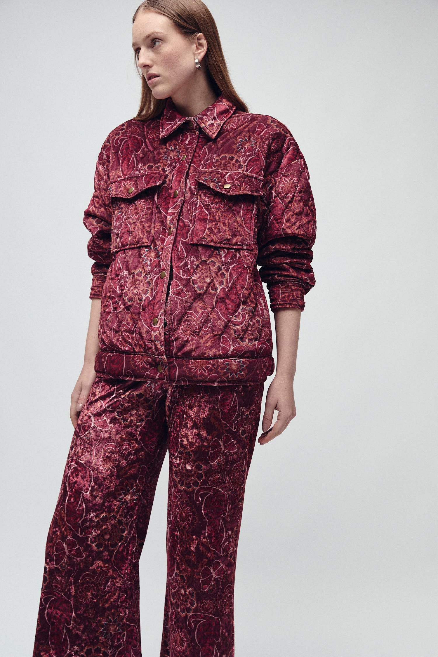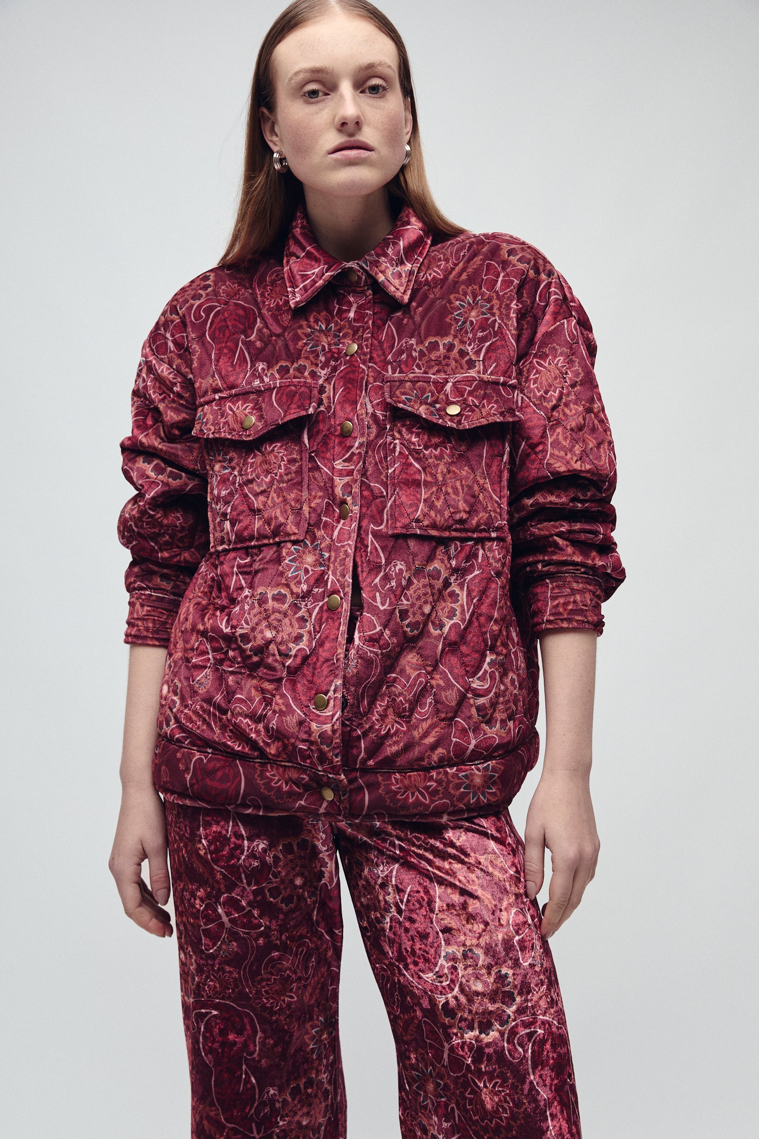 Casaca estilo puffer de fit oversize hecha de velvet bordado con nuestro estampado único “Oracles”
