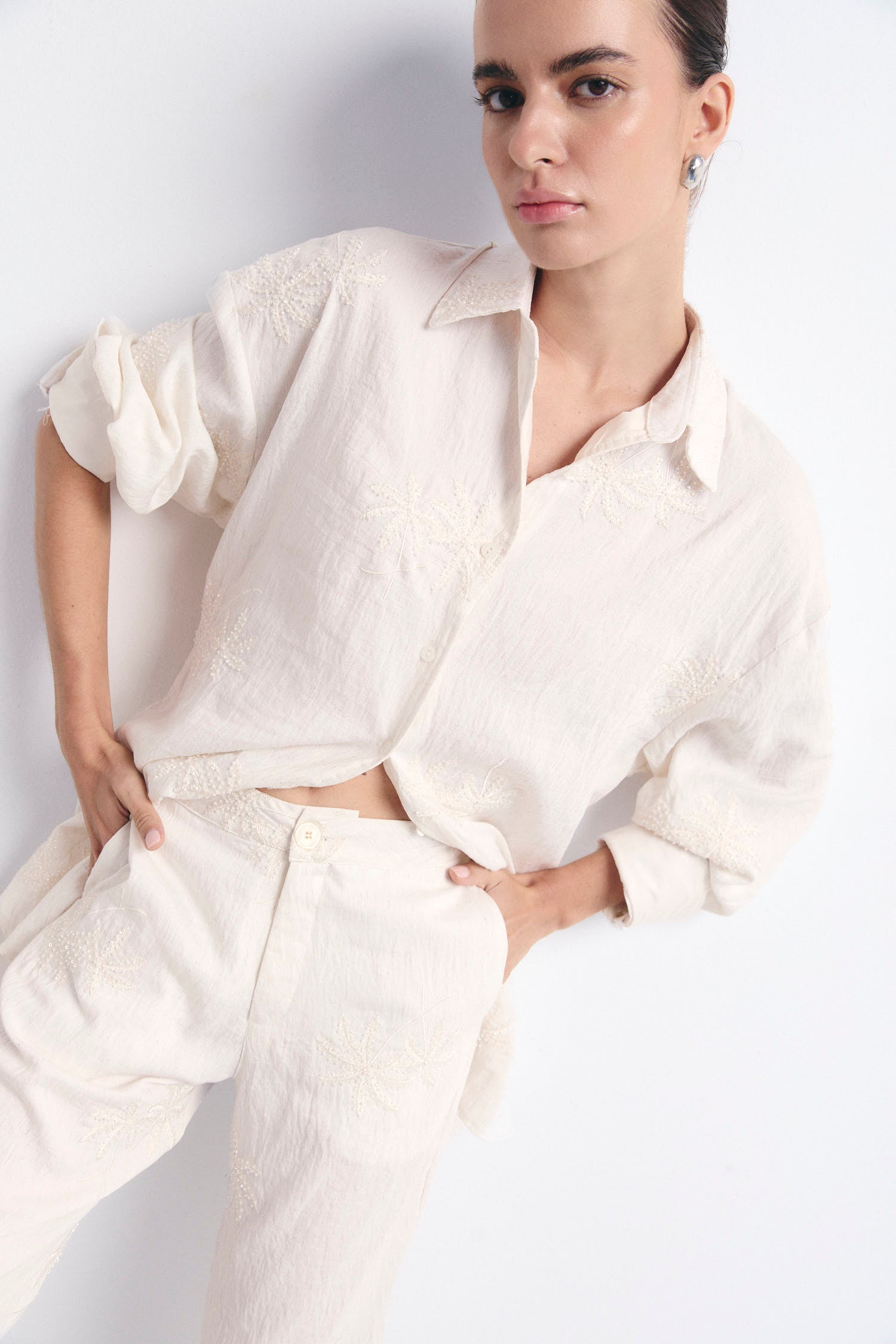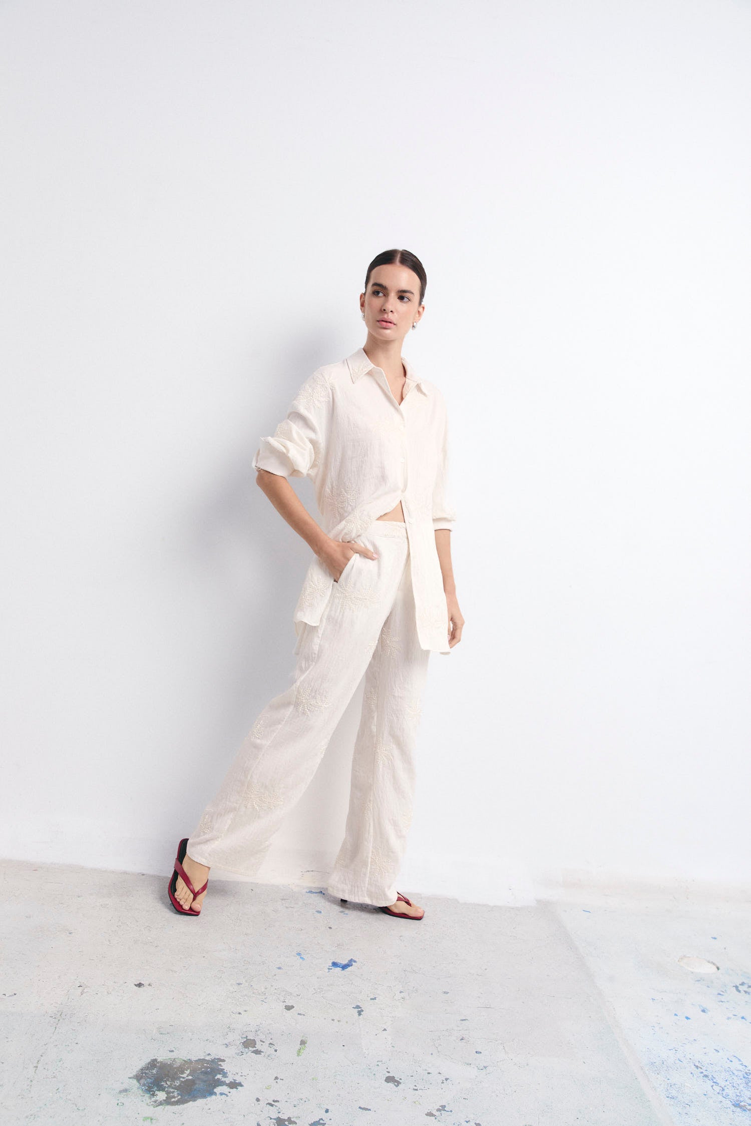 Pantalón recto en tela de lino con bordado de palmeras en mostacillas.