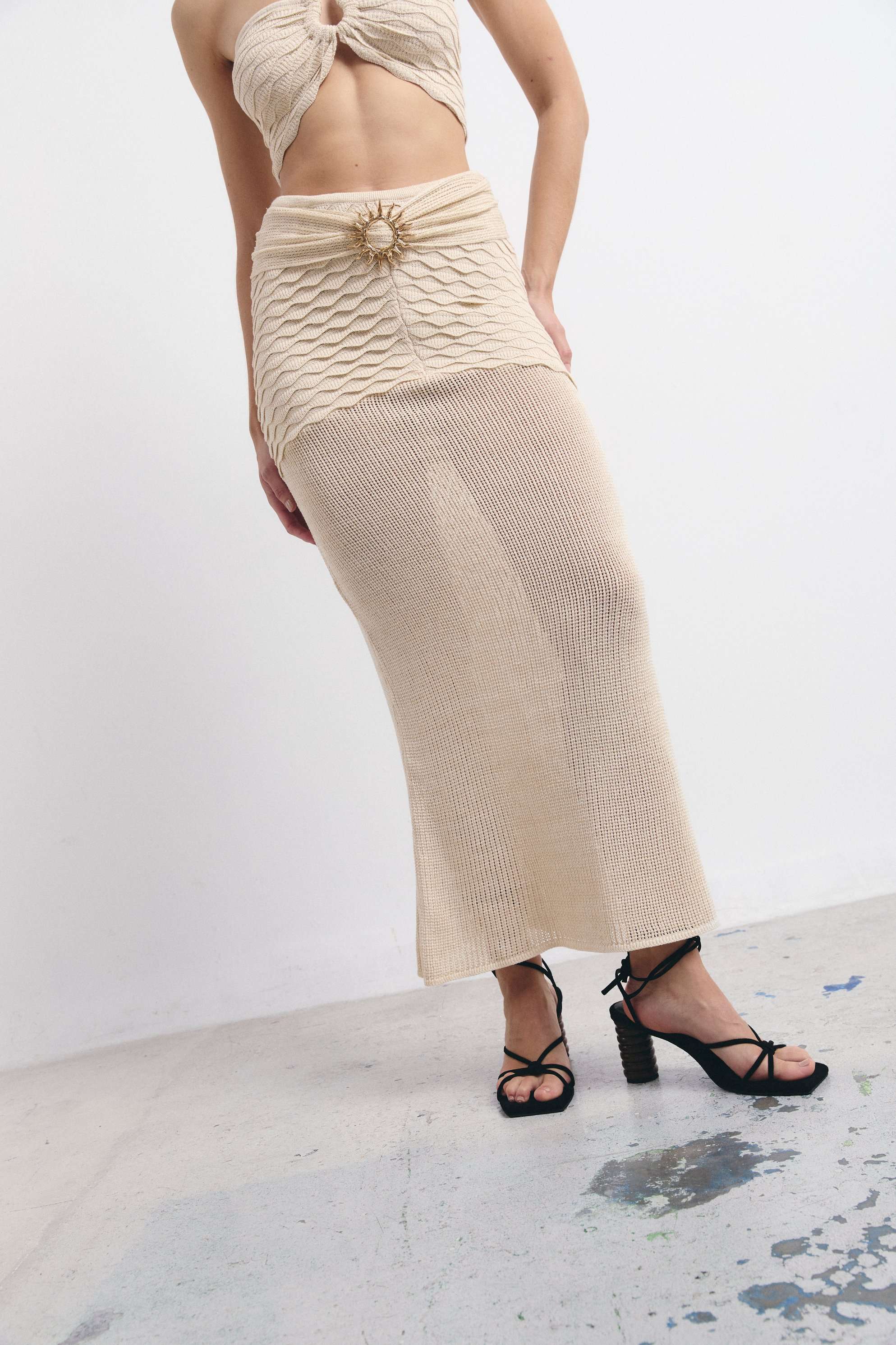 Set tejido de top y falda larga calado con punto de escamas. Lleva hebilla e hilo de lurex.