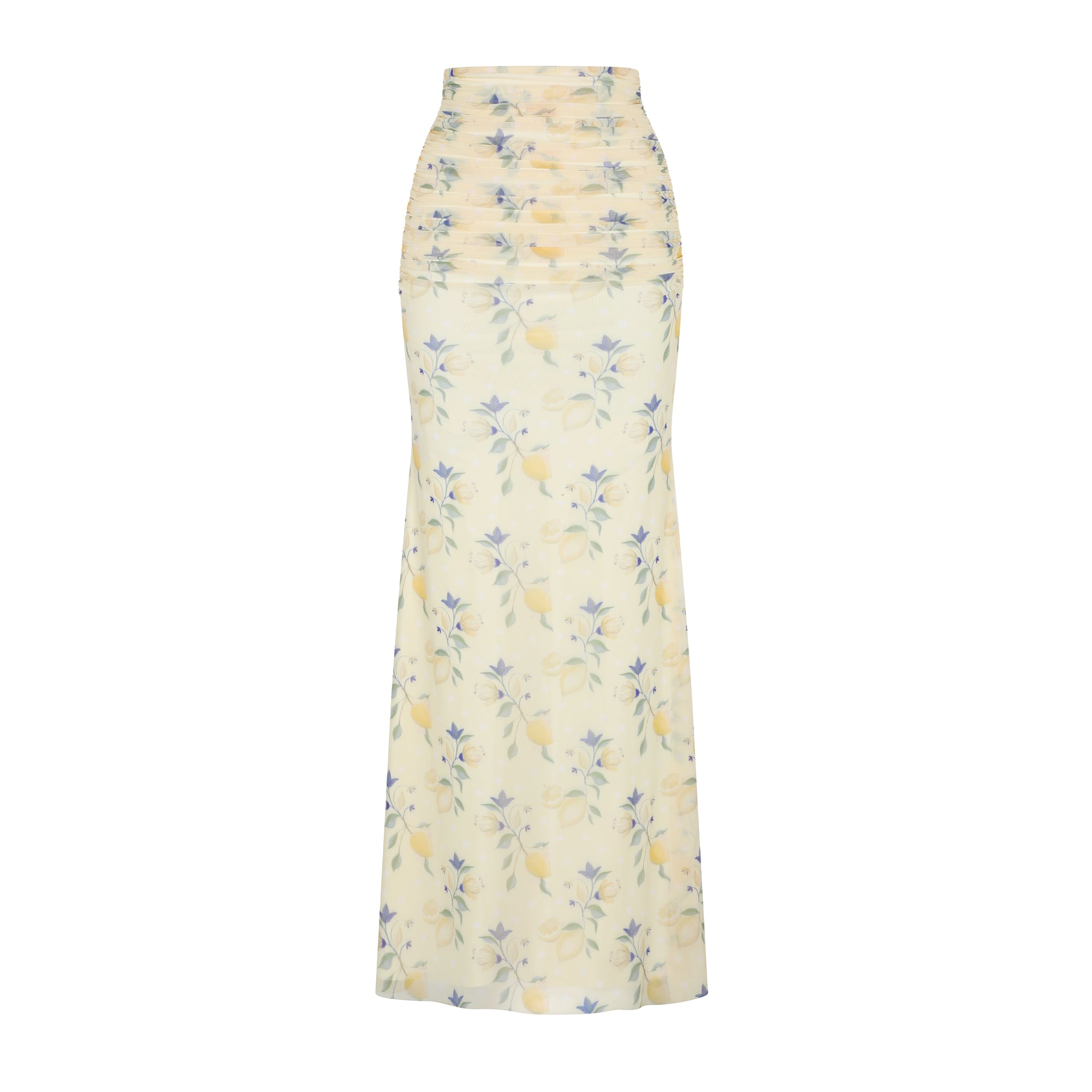 Falda larga en tela mesh estampada, lleva drapeado hasta la altura de la cadera.