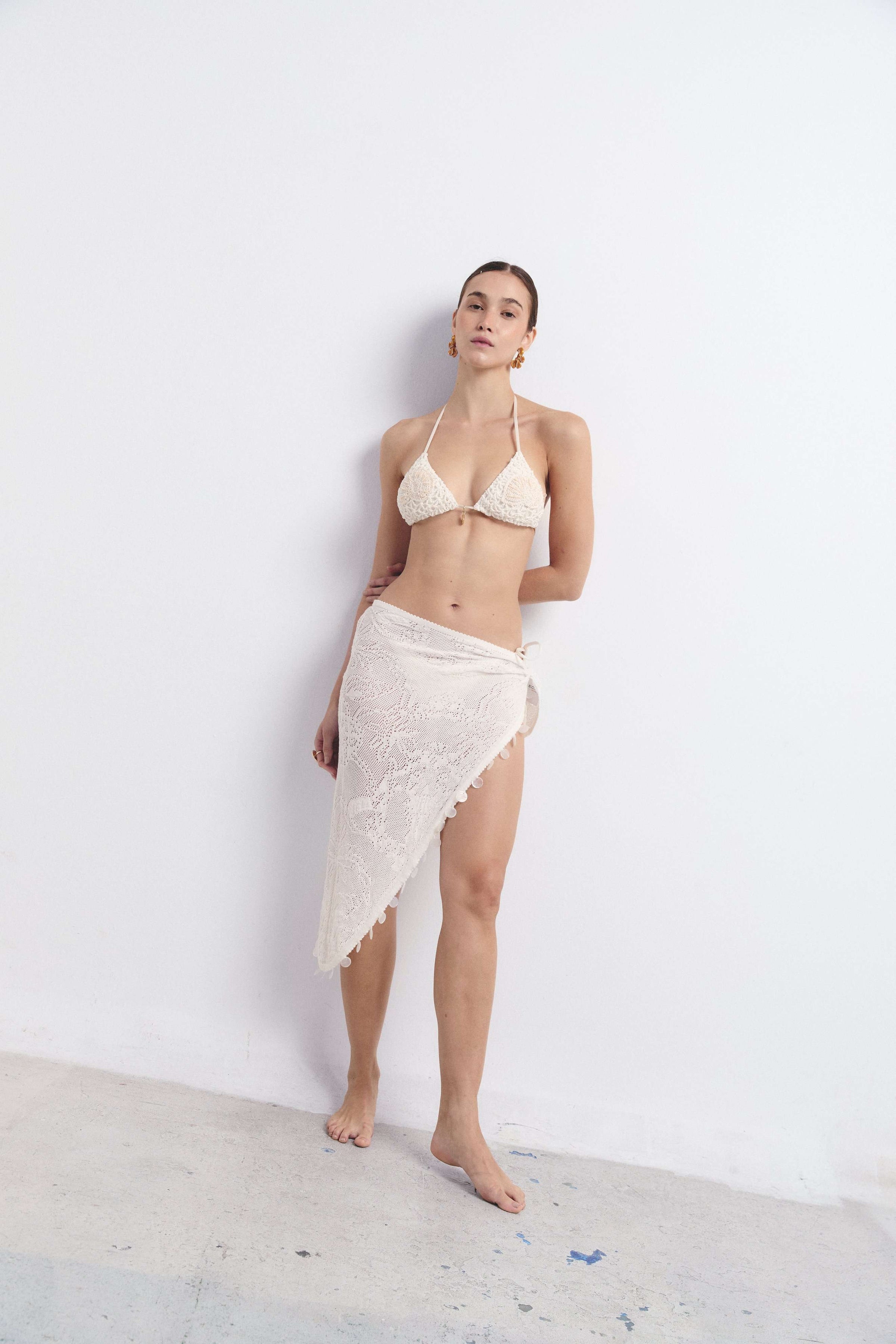 Falda tejida envolvente en punto encaje calado con detalle de aplicaciones bordadas.