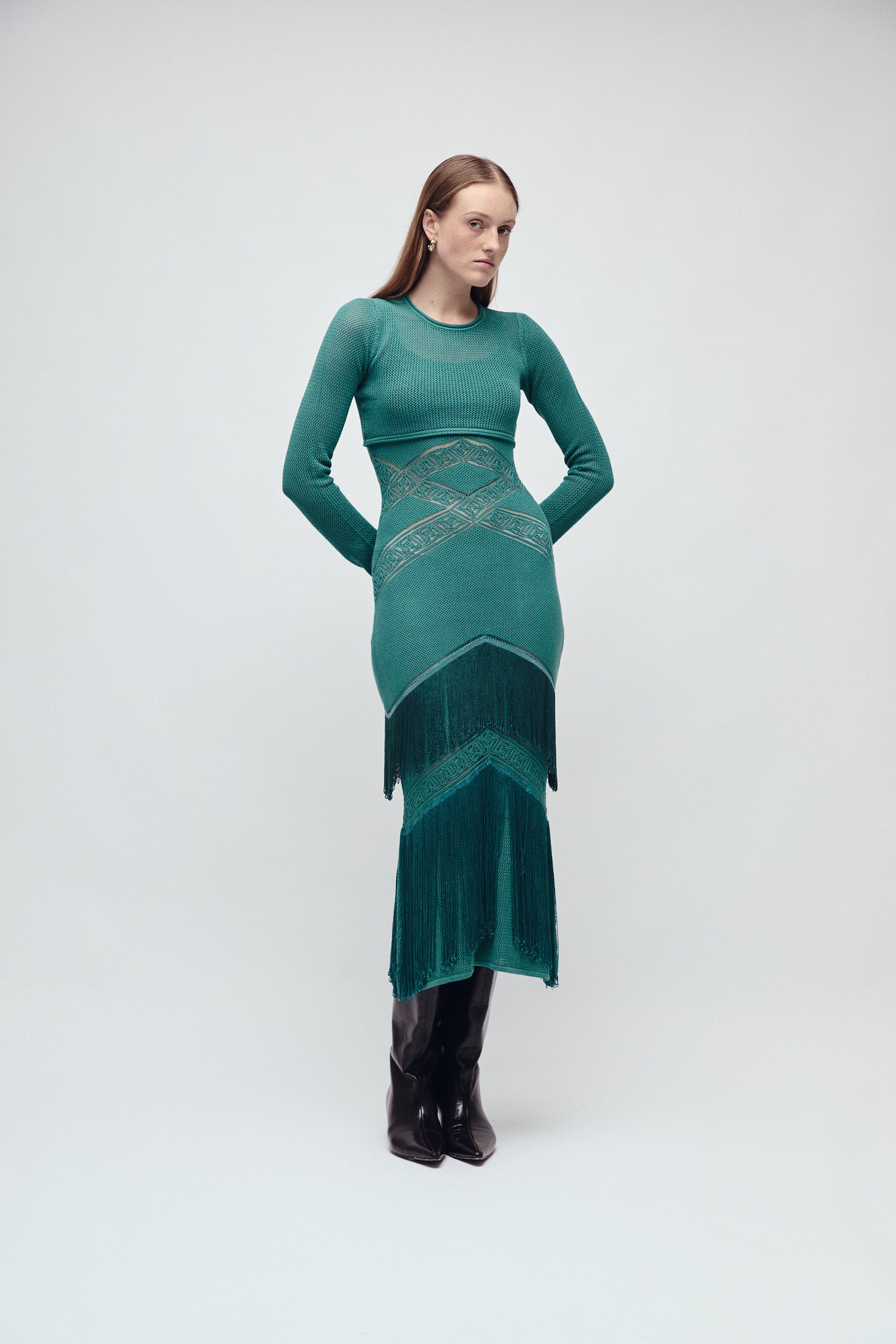 Vestido tejido con fibras naturales, con mix de puntos, flecos de seda puestos a mano y top removible.