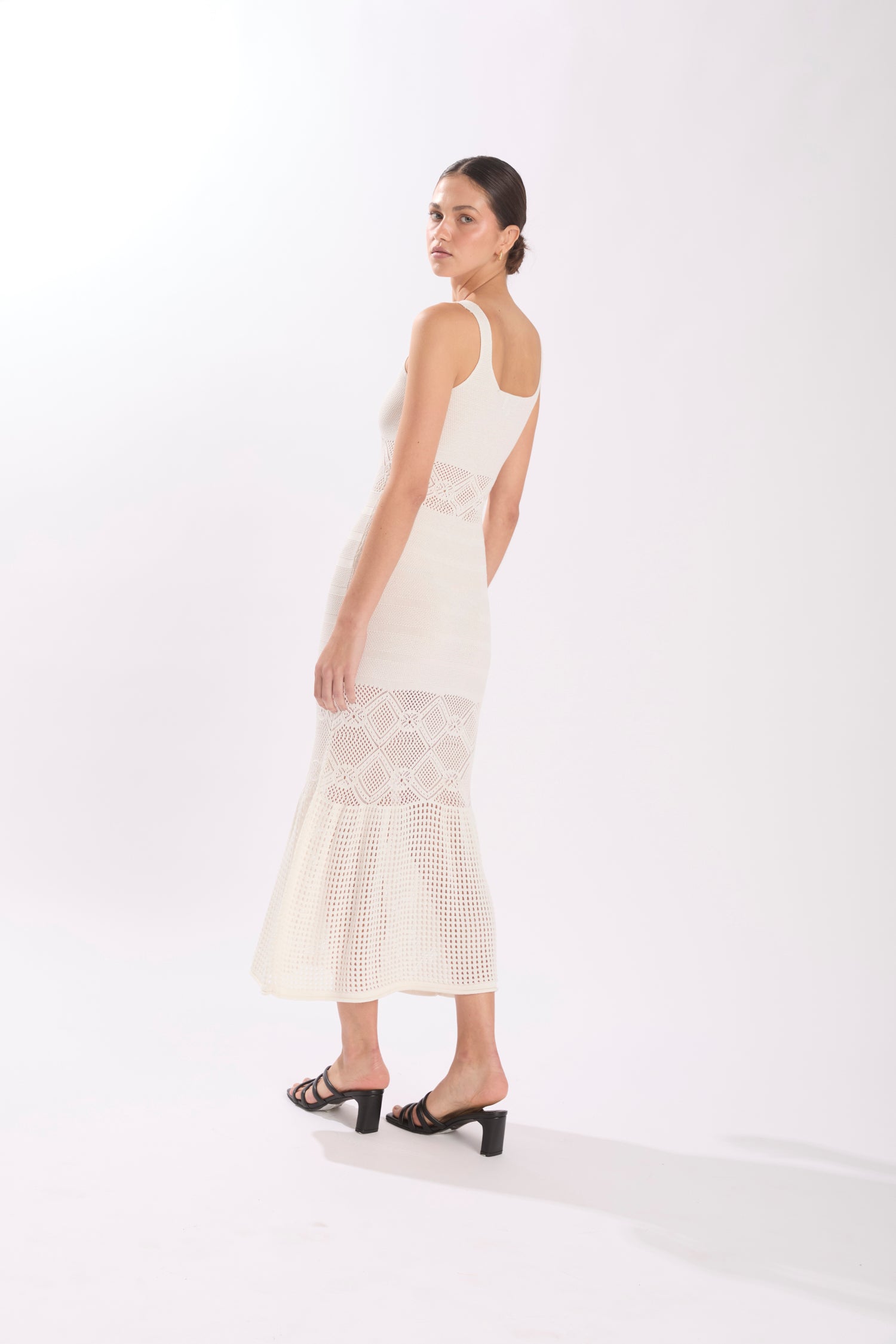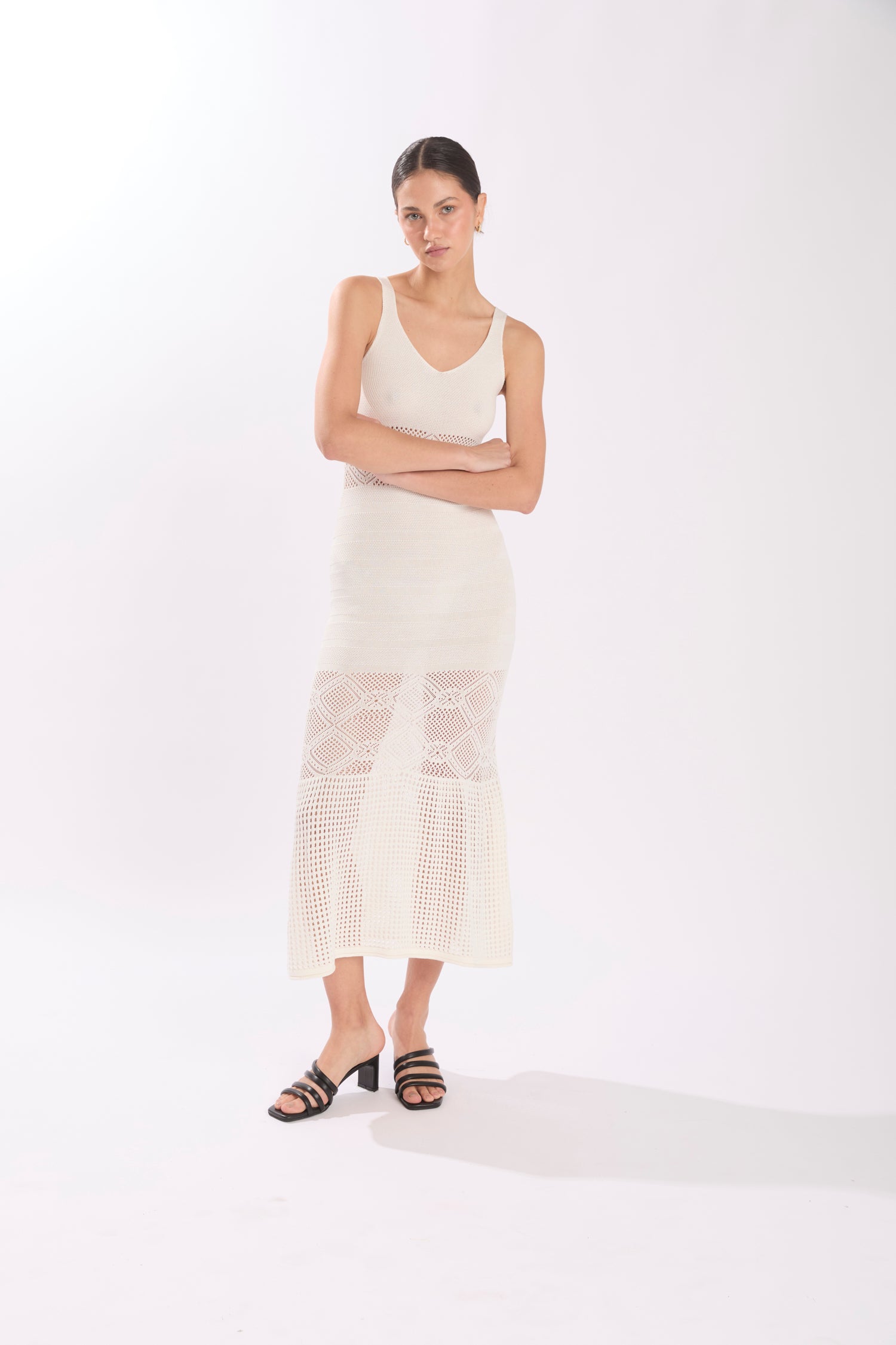 Vestido corte sirena tejido con fibras naturales, mezcla de puntos y detalle calado en la basta.