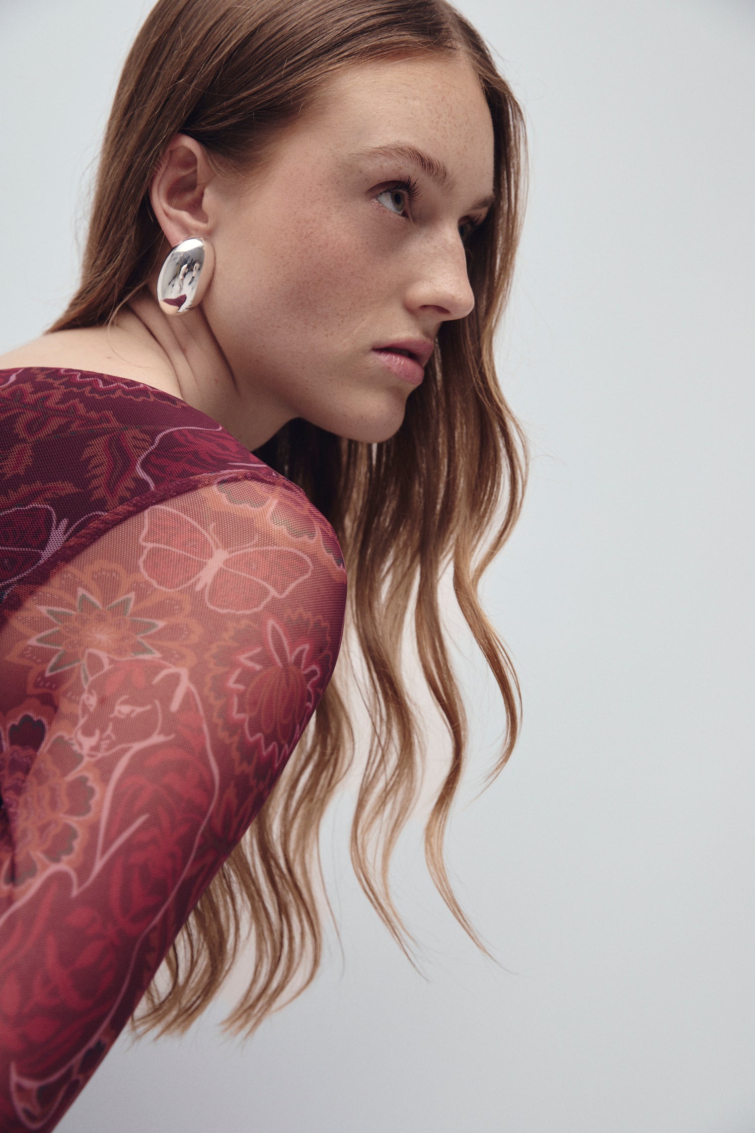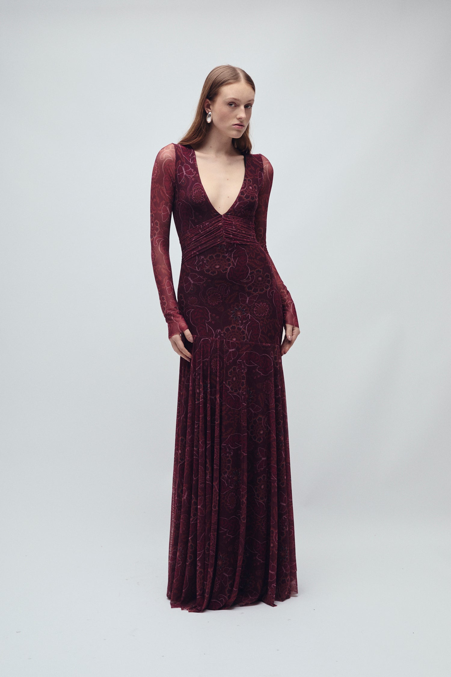 Vestido de manga larga hecho con mesh, escote estilo V y vuelo en la falda.