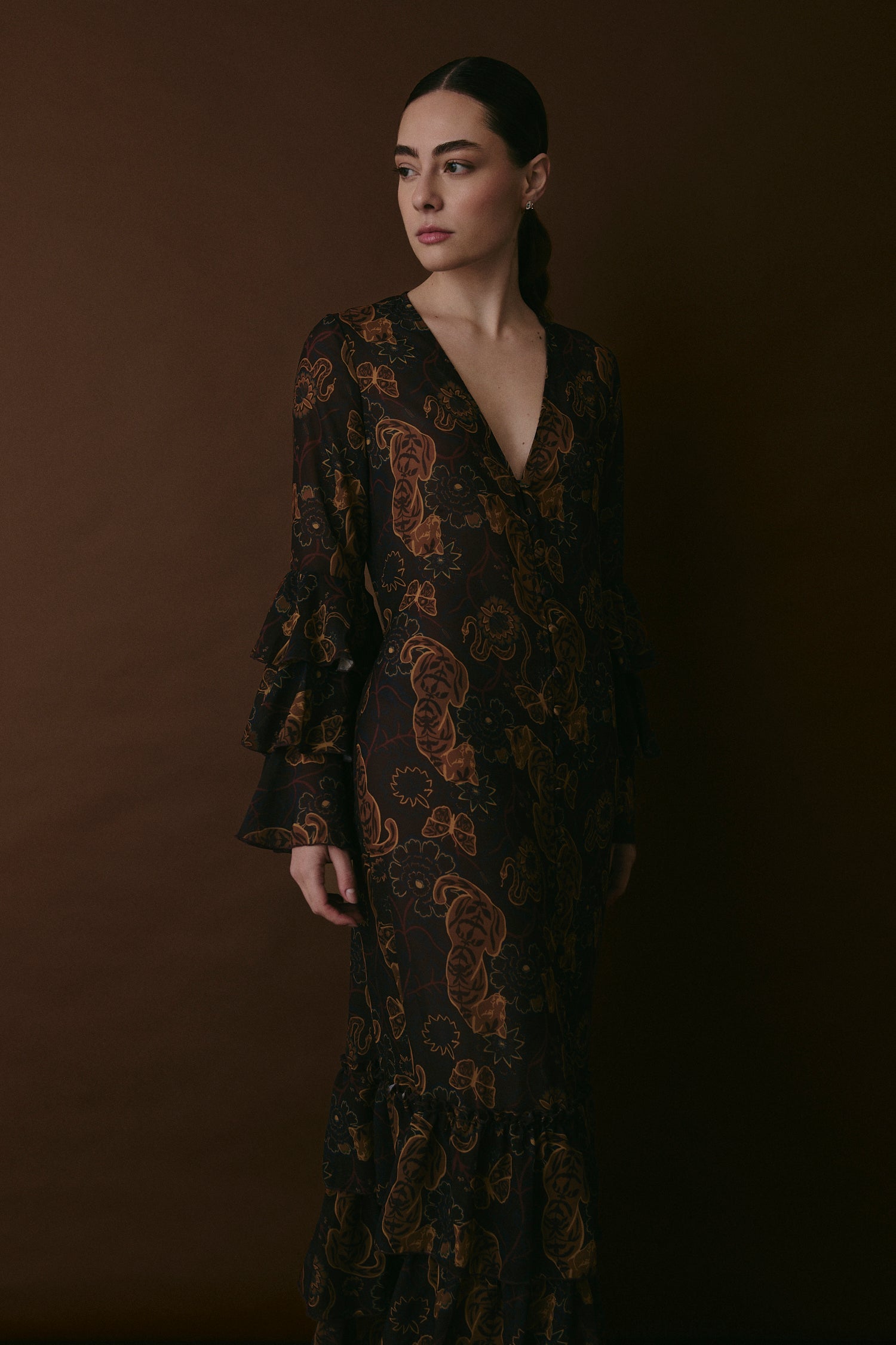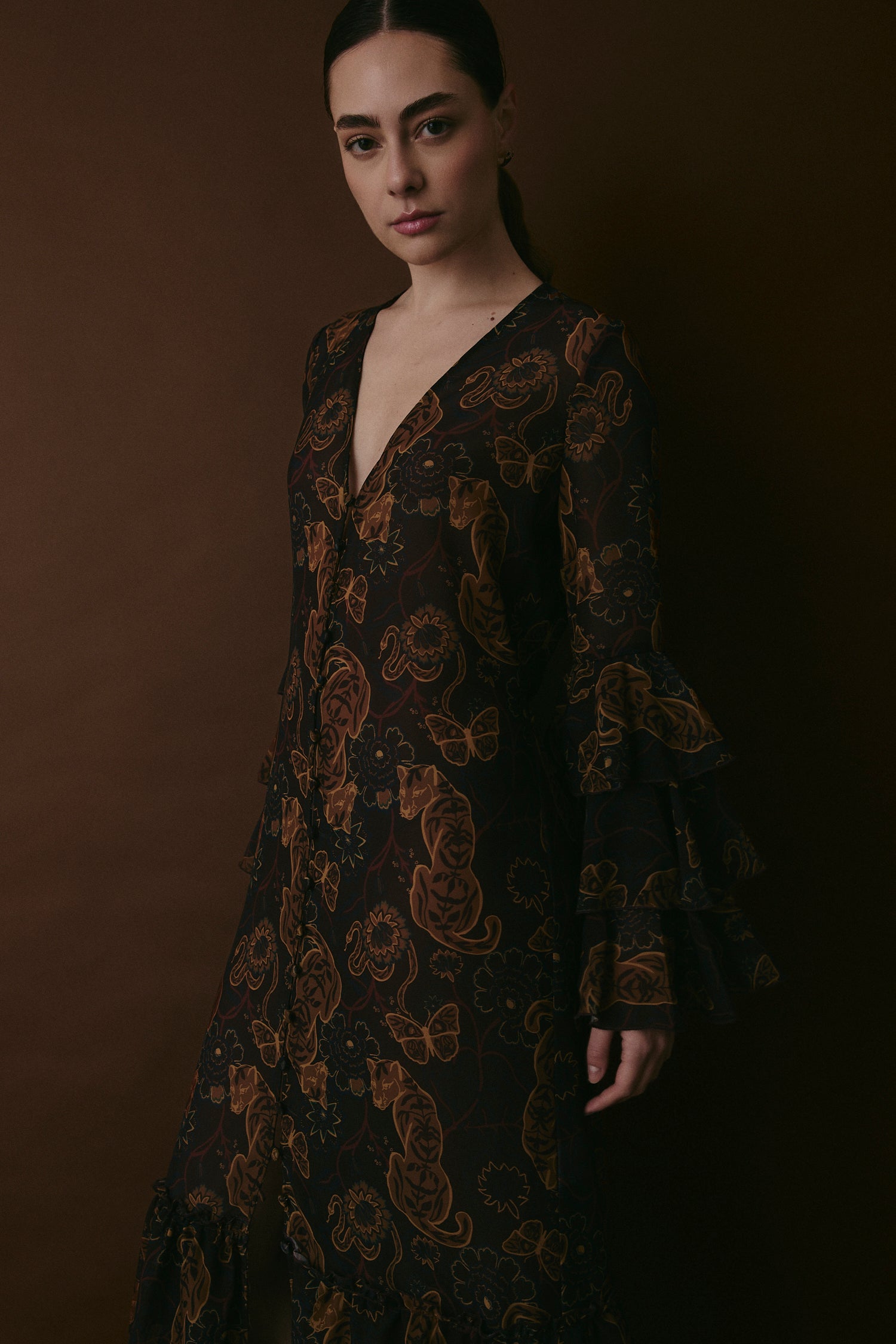 Vestido estilo kimono hecho con gasa estampada, con detalle de vuelos y botones delanteros.