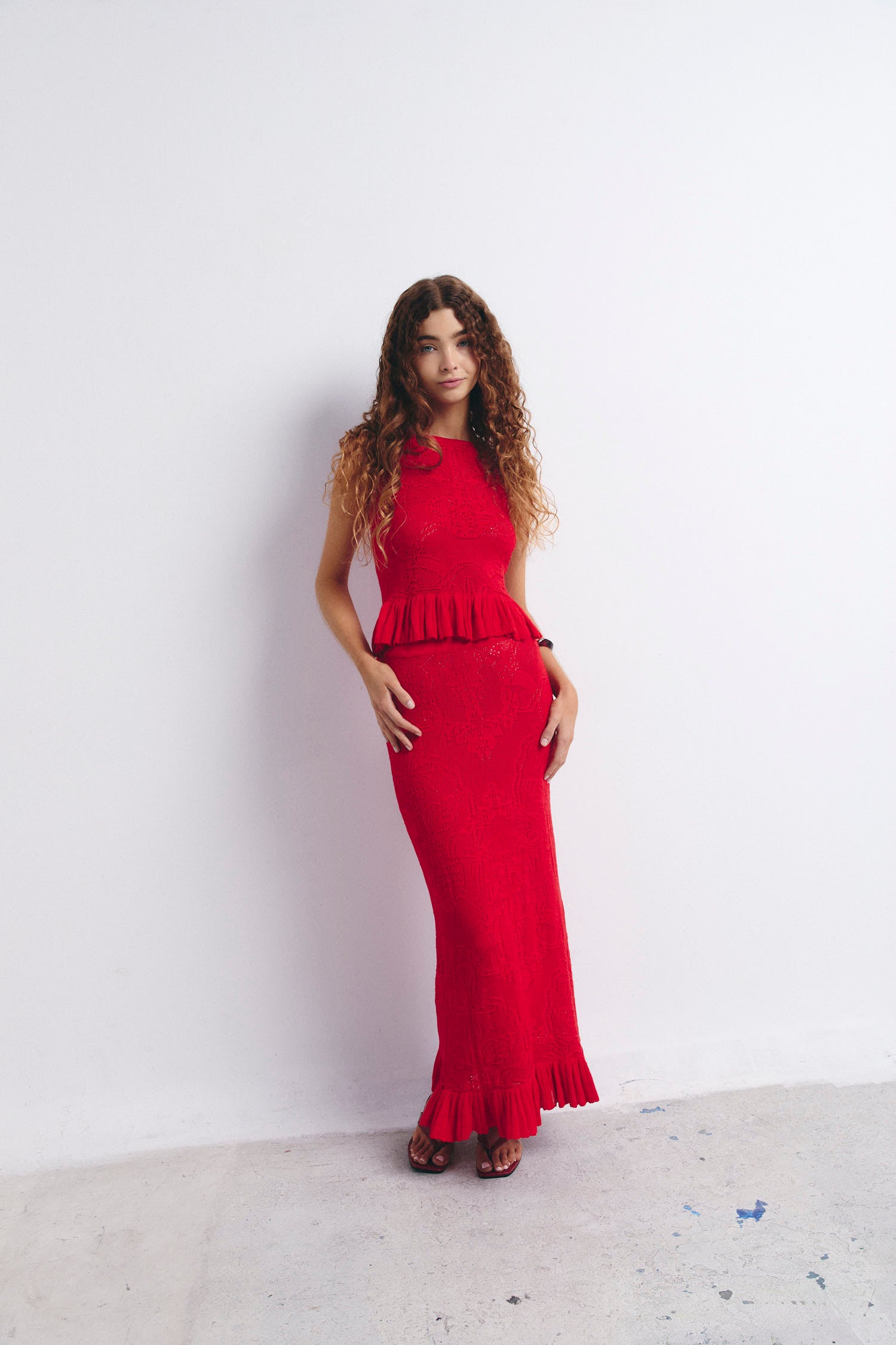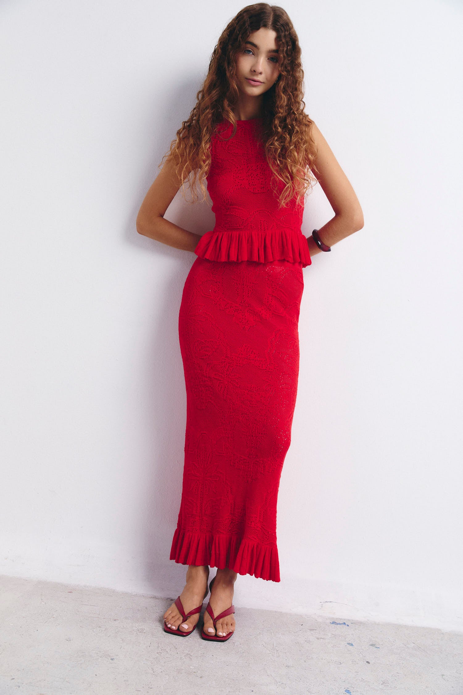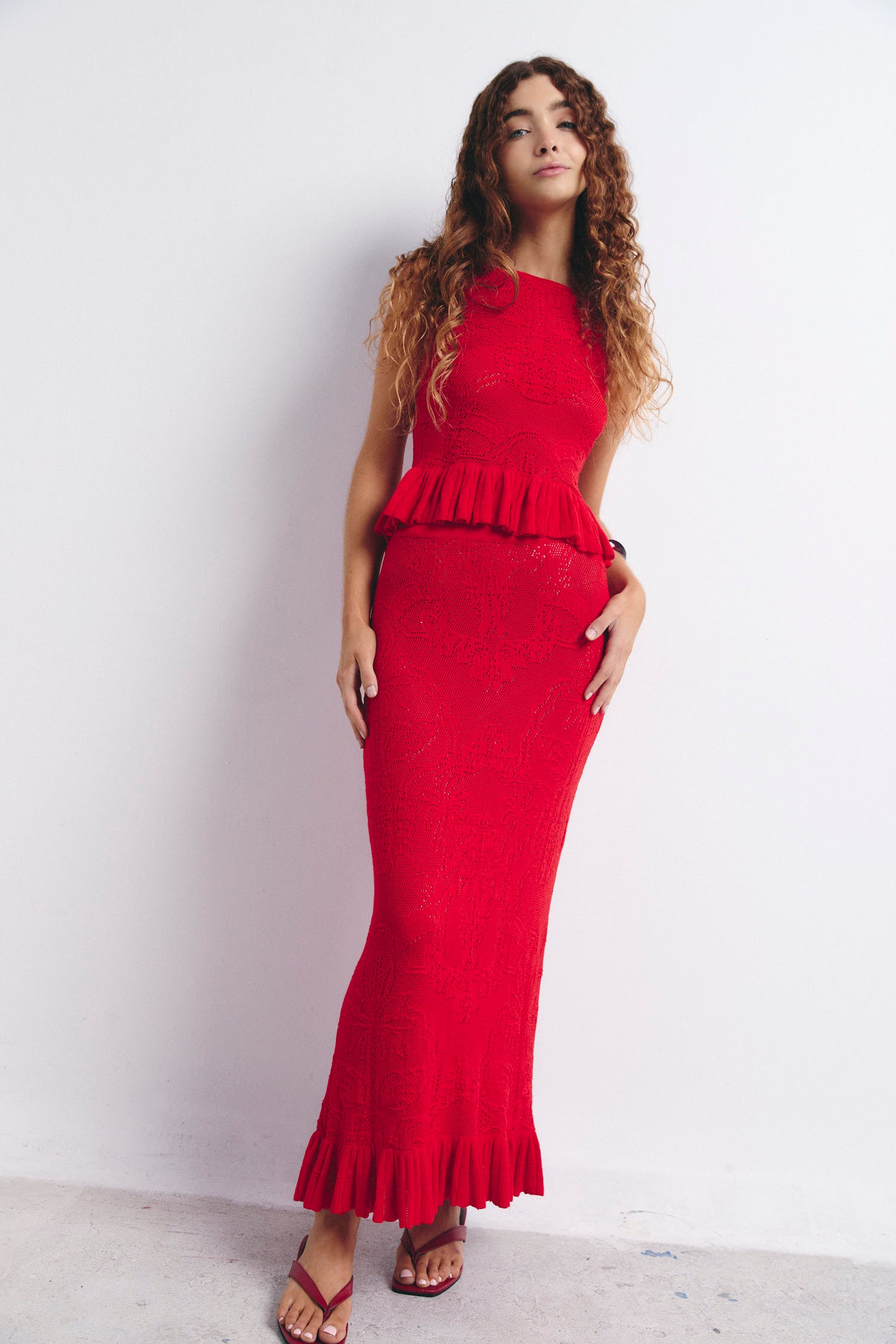 Falda tejida con punto calado y patron Tossa, bobo en basta.
